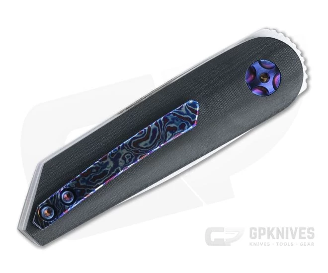 Handle: Thick titanium liners support classy black linen Micarta scales that are subtly contoured for comfort in the hand. The clean, simple and ergonomic handle design with a form factor not much larger than an 84 mm Swiss Army Knife. Inside the liners are engine turned jeweled for a truly custom feel. A double detent mechanism gives solid full stops at open and closed positions with smooth flipper operation. The simple black scales highlight the custom anodized hardware, abalone inlaid front pivot with polished collar and Timascus back spacer.