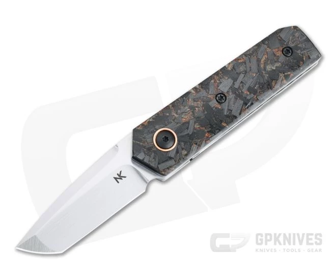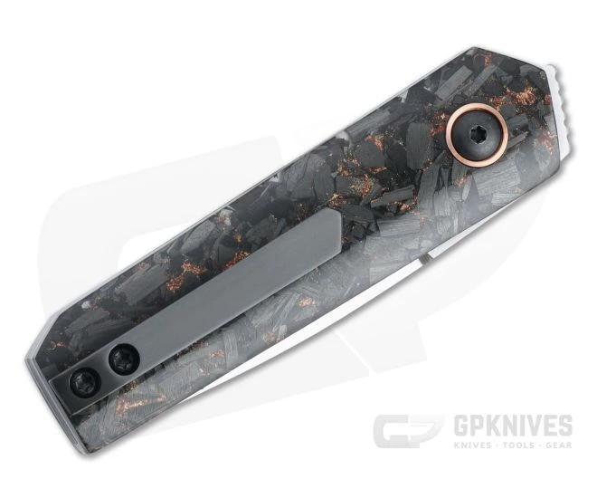 Handle: Thick titanium liners support dazzling copper shred carbon fiber scales for lightweight performance and style. Minimalist in design, the handle has clean lines with a compact form factor similar in size to an 84 mm Swiss Army Knife and are subtly contoured for comfort in the hand. The liners are engine turned jeweled on the inside for a truly custom feel. The liner lock mechanism is smooth in operation and delivers rock solid lockup for safe use. Construction is completed with black titanium Torx hardware with copper pivot collars and matching copper shred carbon fiber back spacer.