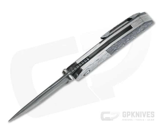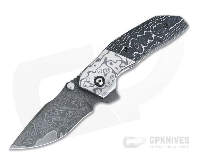Blade: The broad, recurve blade is made from Nichols Armor Core Damascus with a mid-height hollow grind that tapers to a razor sharp cutting edge. A small thumb scoop gives way to a tapering top swedge that ends in a fine piercing point. Jimping at the base of the spine gives added traction. The detent is moderate, offering a smooth and decisive deployment via a caged ceramic ball bearing pivot and deploys via the subtle flipper tab or dual thumb studs.