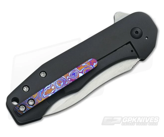 The Handle: Bead-blasted full titanium slabs give this folder a solid feel while contouring and pronounced forfinger groove offer a comfortable grip. The back titanium slab forms a reliable and smooth frame lock mechanism. Torx construction with standoffs and open spine.