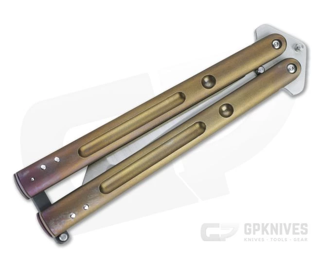 Custom maker Chuck Gedraitis delivers a stunning, tactical-inspired balisong in his #208 Balisong. Solid titanium handles and fine tolerance construction makes this a smooth operating bali while the two-tone satin, compound ground “Yakuza” Tanto blade and bronze anodized orange peel textured handles offer a striking visual appeal for users and collectors alike. This piece is marked #208 and features a satin finished CTS-XHP blade, anodized titanium handles with G10 spacers and a zinc latch.