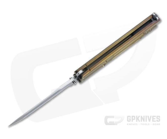 Handle: Orange peel textured, full titanium slabs are anodized a handsome bronze and milled with channels and divots for solid traction in use. The slabs are joined by black and gray G10 spacers and secured in open and closed positions by a zinc latch with titanium pin. Satin hardware rounds out the construction. Includes padded Ace Case zippered pouch for storage.