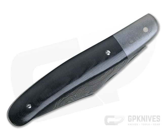 Handle: Stainless steel liners support polished Black Canvas Micarta handle scales and Damascus steel bolsters all meeting seamlessly. A full length Damascus backs spring rounds out the handle construction and is embellished with the same file work found on the spine of the blade.