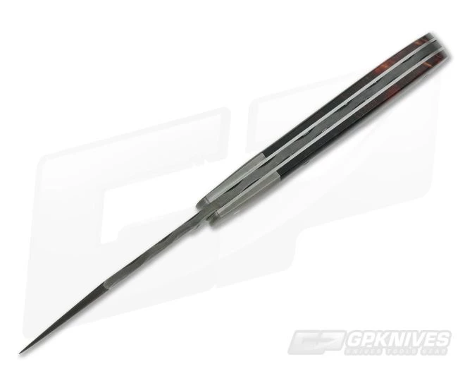Blade: Hawes hand forged Damascus combines 180 layers of 1080, 5160 and 15n20 high carbon steels creating a unique Burl pattern. The Copperhead-style clip point blade is opened with single nail nick and comes razor sharp. File work at the thumb ramp adds some traction and a custom feel. The blade opens with a pronounced half stop with strong back spring construction.
