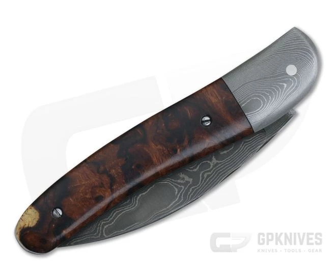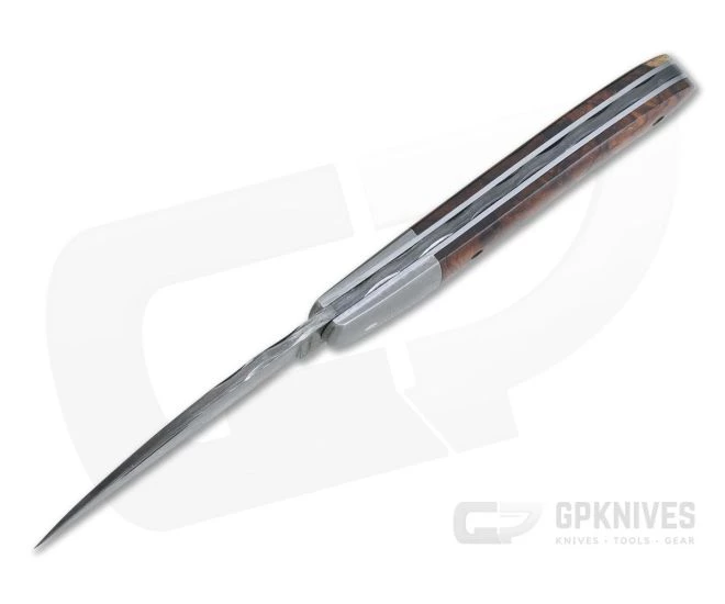Blade: Hawes hand forged Damascus combines 160 layers of 1095 and L6 high carbon steels creating a unique Burl pattern. The Whittler-style Wharncliffe blade is opened with single nail nick and comes with a razor sharp convex grind. The straight edge and fine point are perfect for small wood working projects while the file work along the spine adds a custom feel. The blade opens with a pronounced half stop with strong Damascus back spring construction.