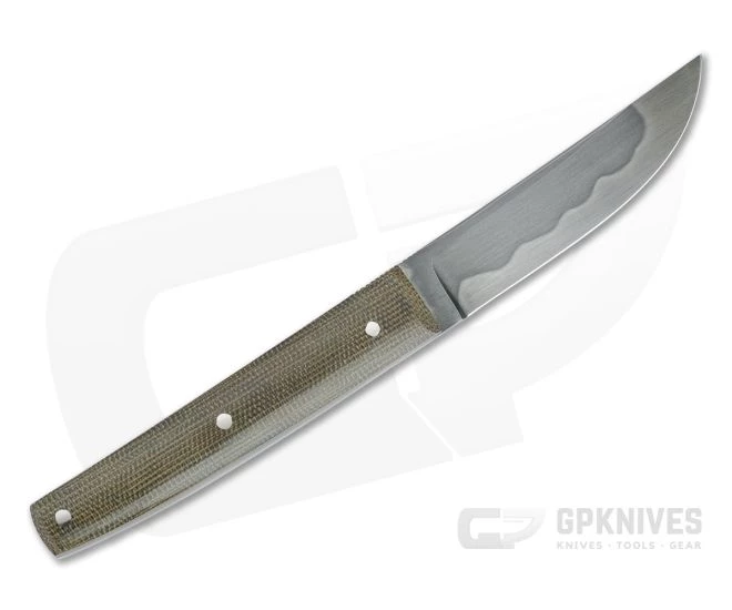 Handle: Stainless pins solidly secure the comfortably contoured, polished green canvas Micarta handles to the full tang. Offering a clean, handsome look with visual appeal for collectors, the handles are durable and well-designed for serious use with a taper to the pommel that offers a surprisingly secure grip while retaining speed in the hand.