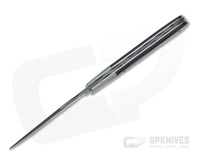 Handle: Stainless steel liners support handsome Red Linen Micarta handle scales and Damascus steel bolsters all fit flush. A full length Damascus back spring is embellished with the same file work found on the spine of the blade rounding out the handle construction.