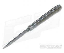 The Blade: Hawes handforged damascus combines 15N20 stainless with 1095 carbon steel for a bold and distinct pattern. Drop point style with single nail nick, razor sharp plain edge and custom filework along the spine. Pronounced half stop with medium backspring construction.