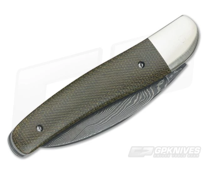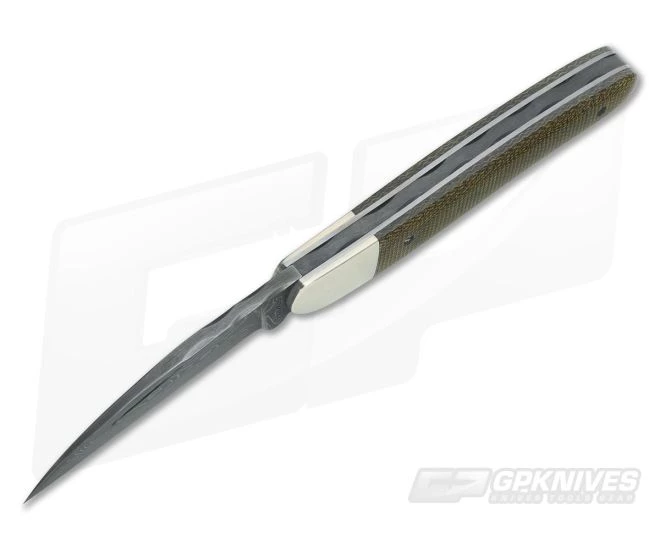 The Handle: Stainless steel liners sit under polished OD green canvas micarta handle scales and stainless steel bolsters all meeting seamlessly. A full length fileworked damscus backspacer brings the entire piece together.