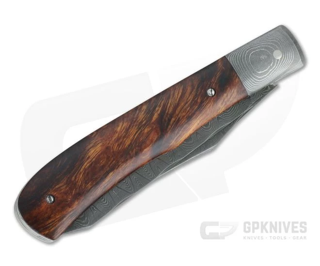The Chuck Hawes Custom Trapper is a classic slip joint design made in the traditional fashion. Strikingly figured Desert Ironwood handle scales are flush fit to Damascus steel bolsters on a foundation of stainless steel liners. The handles house dual, hand forged Ladder pattern Damascus blades in the traditional Trapper combo: a slim clip point and robust Spey blade.