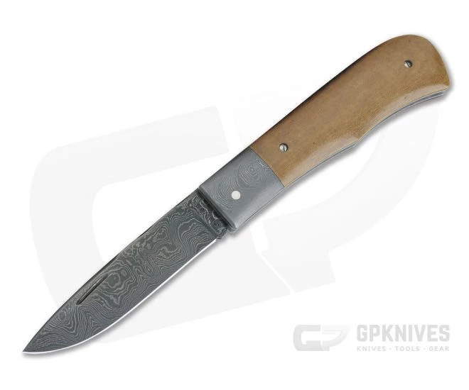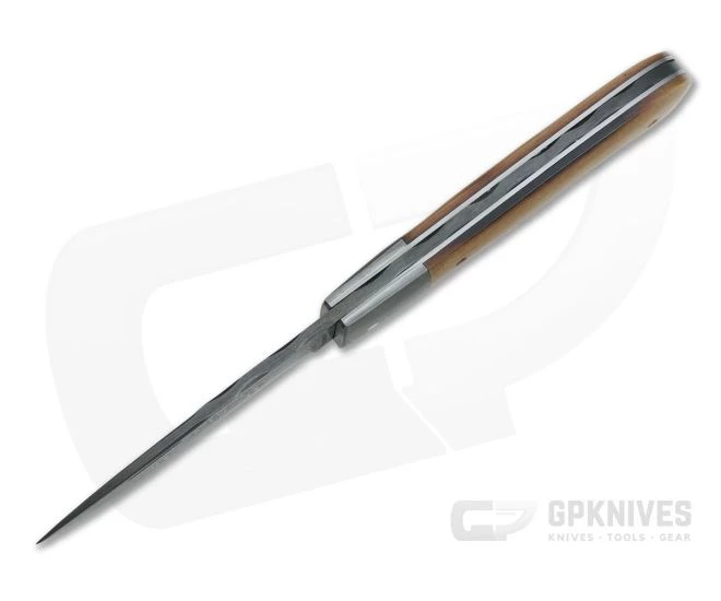 Blade: Hawes hand forged Damascus combines 160 layers of 1095 and L6 high carbon steels creating a unique Burl pattern. The Remington-style drop point blade is opened with single nail nick and comes with a razor sharp convex grind. The forward swedge and file work along the spine adds a custom feel. The blade opens with a pronounced half stop with strong Damascus back spring construction.