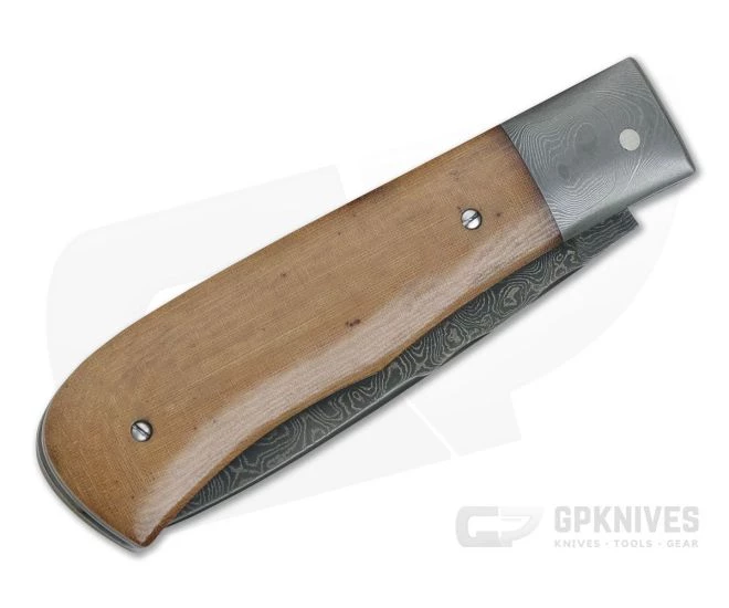 Handle: Vintage Westinghouse Micarta handle scales are attached to stainless steel liners and flush fit to Damascus steel bolsters for a striking yet classic look. A full length Damascus back spring rounds out the handle construction and is embellished with the same file work found on the spine of the blade.