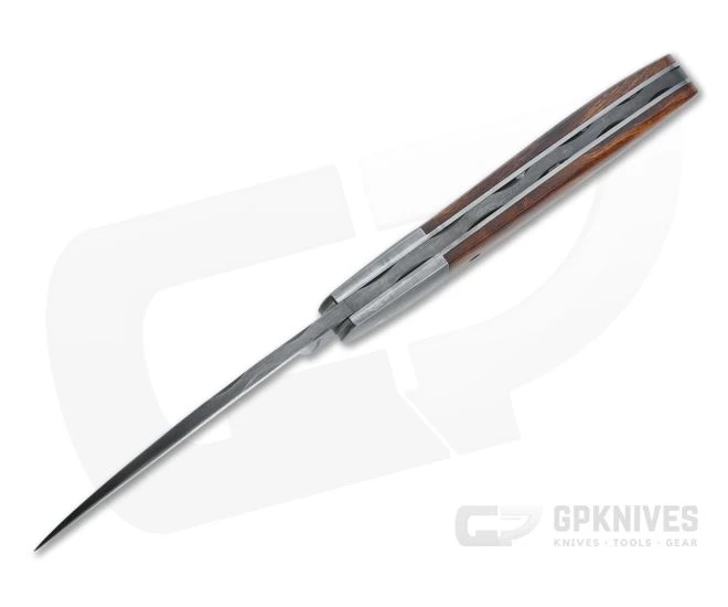 Designed as a modern take on the classic whittle pattern the Chuck Hawes Custom Wharncliffe Whittler delivers the classic robust slip joint folding knife with hand make precision and stunning looks. This custom piece has highly figured Desert Ironwood handle scales flush fit to Damascus bolsters with matching file worked back spring and a hand forged Modified Ladder pattern Damascus blade.