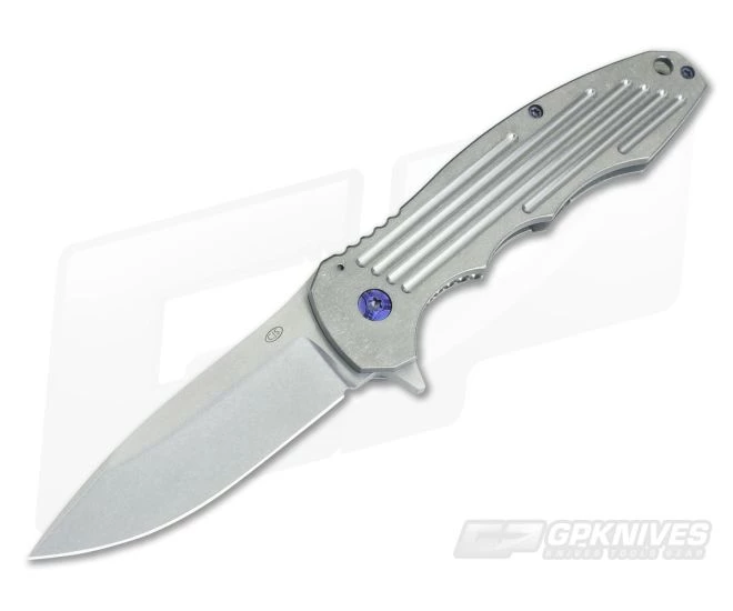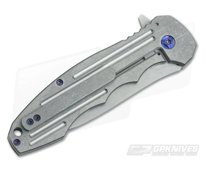 Handle: Dual slabs of milled 6AL-4V titanium form the handles with polished, milled grooves for traction and a tumbled finish for a clean yet industrial look. The handles are milled with prominent finger grooves and jimping on the spine for security in the hand. One slab also forms the integral frame lock which is smooth and reliable with scallops on the lock bar for easy of operation. Custom blue anodized titanium pivot, Torx screws and barrel spacers complete the construction.