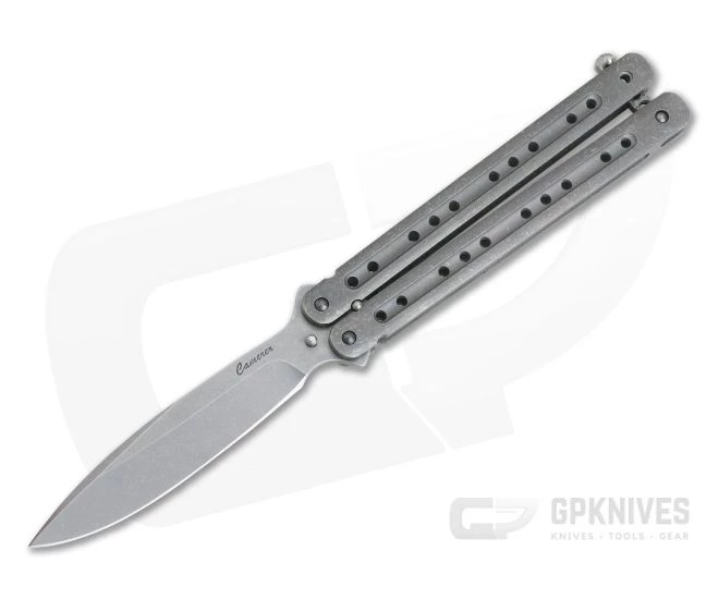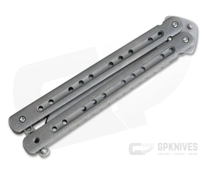 The Continuum is a new “Mid-Tech” balisong design from maker Craig Camerer. It is actually much more custom than production as the blade is hand ground by Mike Irie with milled, drilled and finished the water-jet cut handles. Everything is then hand finished by Craig for a truly custom feel. This piece is a highly functional work of art sure to be a standout in your collection. The skeletonized handles are channel milled for an integral construction with machined grooves and holes for weight reduction and traction in the hand. The blade is stonewashed CPM-154 while the handles are acid washed and tumbled.