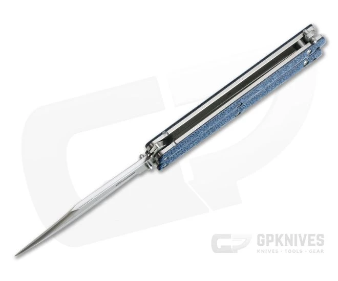 Handle: Full length titanium liners provide the foundation for beautiful, contoured, Blue Geodesic Micarta handle scales. Open pillar construction gives the handles good balance and makes for easy cleaning and maintenance as well as offering a view of the orange peel texture on the interior, a truly custom detail. A robust titanium latch keeps the blade locked securely in the open or closed position for safety.