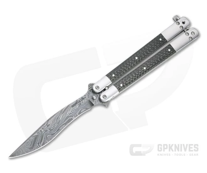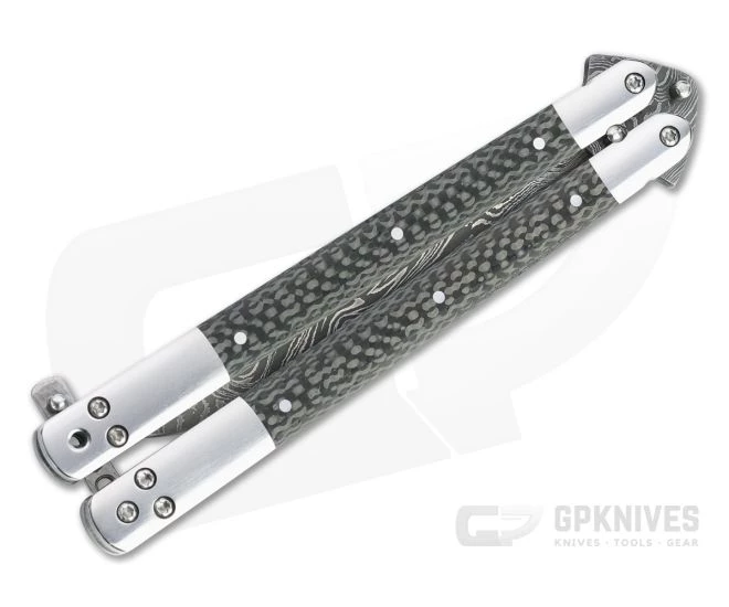 This custom balisong from maker Craig Camerer is a stunner! You can feel the craftsmanship and hard work Craig put into this piece as soon as you pick it up. This piece comes with a custom Twisted “W” pattern carbon Damascus recurve blade and titanium handles with carbon fiber inlays.