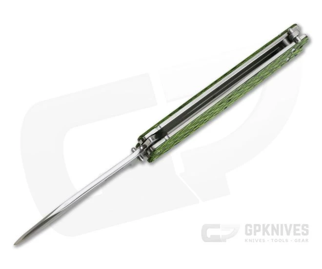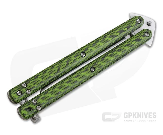 This custom balisong from maker Craig Camerer is a stunner! You can feel the craftsmanship and hard work Craig put into this piece as soon as you pick it up. Beautifully satin finished, Recurve blade is made from premium Bohler Elmax stainless steel paired with unbelievably eye-catching Black and Green Carbon Fiber handle scales. This is a refined piece for the user or collector alike.