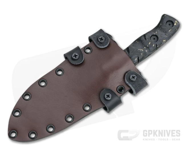 Handle: Thick, rounded shred carbon fiber scales are attached with black stainless steel hardware to the full tang for a rock solid handle. Matte finished and milled with deep grooves for a secure grip the handles are contoured for comfort in heavy use and have gold flecks for a touch of style. Each knife is 100% hand made and includes a Certificate of Authenticity with spec sheet and serial number.