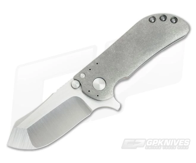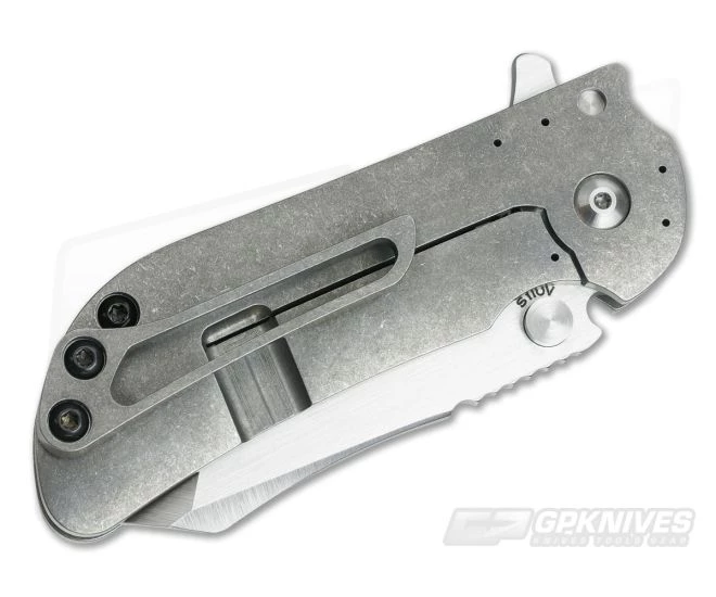 Handle: Beautiful in its simplicity, the M8 has a contoured titanium handle construction with a classy and rugged tumbled finish. Three spool shaped titanium back spacers with black Torx hardware, everything together with a massive clip attached for pocket carry.