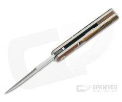 Handle: Modern and clean in form and function, the frame of the handle is formed by two thick satin finished titanium liners. One of these liners also forms the liner locking mechanism which provides solid, secure lock up along with smooth operation. Giving the Barlow a timeless appearance, the scales and back spacer are made from custom “Neck of the Woods” ripplecut G-Carta from G.L. Hansen & Sons. This material delivers style in spades! Natural crosscut canvas bolsters pair well with the scales and are offset with contrasting white liner material. The knife is finished off with satin titanium hardware and a brushed stainless steel shield on the show side.