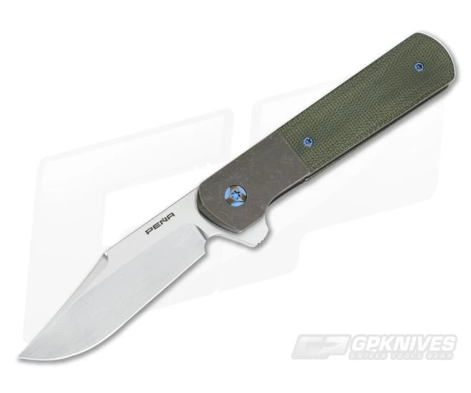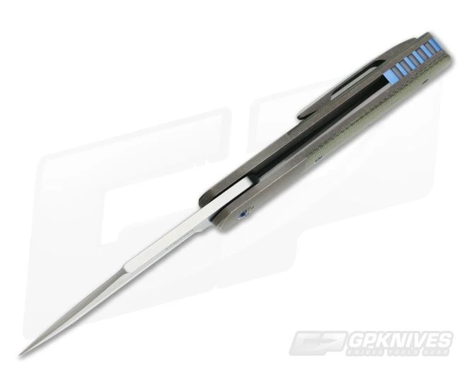 Handle: Modern and clean in both form and function. The Barlow Flipper is built with a frame formed by two thick, tumbled, bronze anodized titanium liners. These liners create a rock solid frame lock, also known as a ‘Bolster lock’ due to the inlaid Green Canvas Micarta scales which form the integral bolsters. A 3D machined Titanium pocket clip carries the same tumbled bronze finish and offers tip-up, right hand only carry. The scales and pocket clip are attached with blue anodized titanium torx hardware and complimented with a two-tone, bronze and blue, custom titanium pivot screw.