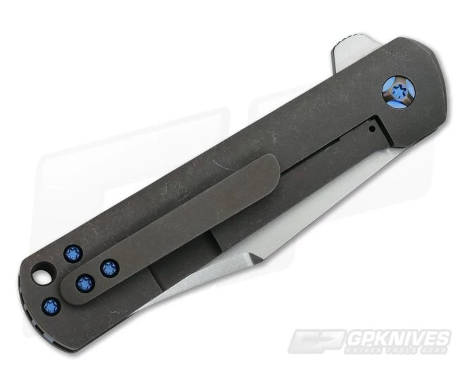 Handle: Modern and clean in both form and function. The Barlow Flipper is built with a frame formed by two thick, tumbled, bronze anodized titanium slabs that are contoured for a clean look and comfortable feel in the hand. On slab forms the integral frame lock which is smooth to operate and offers solid, secure lockup. A 3D machined Titanium pocket clip carries the same tumbled bronze finish and offers tip-up, right hand only carry. The scales and pocket clip are attached with blue anodized titanium torx hardware and complimented with a two-tone, bronze and blue, custom titanium pivot screw.