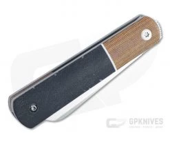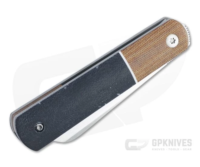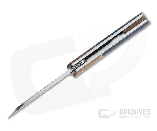 Handle: Thick satin finished titanium liners support handles of durable Micarta, natural canvas for the bolsters separated by white liners from the handsome blue crosscut G-Carta. One liner forms the liner lock mechanism, which provides solid, secure lock up along with smooth operation. Hardware is satin finished titanium with a brushed stainless steel shield inlay. Embroidered Pena nylon zipper pouch included.