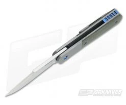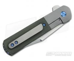The Handle: Modern and clean in form and fuction, the frame of the handle is formed by two rather thick bead-blasted titanium liners. These liners also create integral bolsters as well as a rock solid frame lock (also known as a bolster lock) mechanism. To add to the good looks and awesome feel of the handle, green canvas micarta has been attached via blue anodized titanium torx construction. Complimented with blue titanium pivot, partial backspacer and finished with a bead-blasted titanium pocket clip for tip-up right-hand carry.
