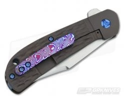 The Handle: In order to keep that classic look Enrique gave the titanium scales a jigged look with a faux bolster. A strategically placed lanyard hole allows for your own personal touch and everything is topped off by an anodized blue backspacer and a gorgeous MokiTi pocket clip for tip-up right-hand carry.