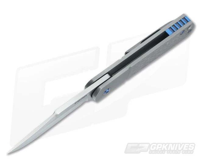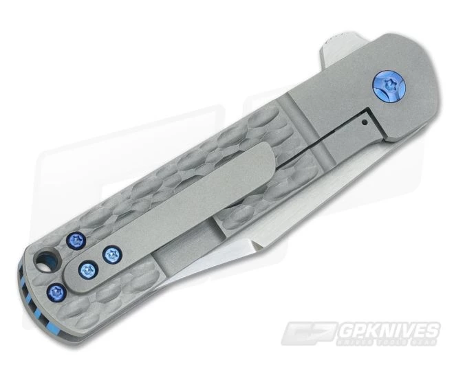 The Handle: In keeping with the classic design Enrique gave the titanium scales a jigged look with a faux bolster and an “antique” bronze anodized stonewash finish. A lanyard hole allows for your own personal touch and the package is rounded out with a two-tone anodized blue and gold titanium backspacer and matching hardware. The knife carries via a tip up, right hand only 3D machined Mokuti pocket clip.