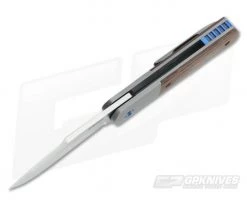The Handle: Modern and clean in form and fuction, the frame of the handle is formed by two rather thick bead-blasted titanium liners. These liners also create integral bolsters as well as a rock solid frame lock (also known as a bolster lock) mechanism. To add to the good looks and awesome feel of the handle, natural canvas micarta has been attached via blue anodized titanium torx construction. Complimented with blue titanium pivot, partial backspacer and finished with a bead-blasted titanium pocket clip for tip-up right-hand carry.