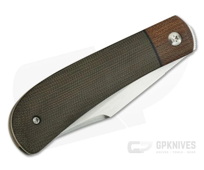 Handle: Modern and clean in form and function, the frame of the handle is formed by two thick satin finished titanium liners. These liners also form the liner locking mechanism which provides solid, secure lock up with smooth operation. Giving the Lanny’s Clip a more classic look are the green canvas Micarta scales with cross-cut natural canvas Micarta bolsters and backspacer all offset with black liner material. The knife is finished off with satin titanium hardware and a brushed stainless steel shield on the front.