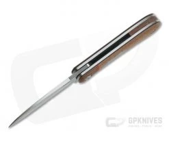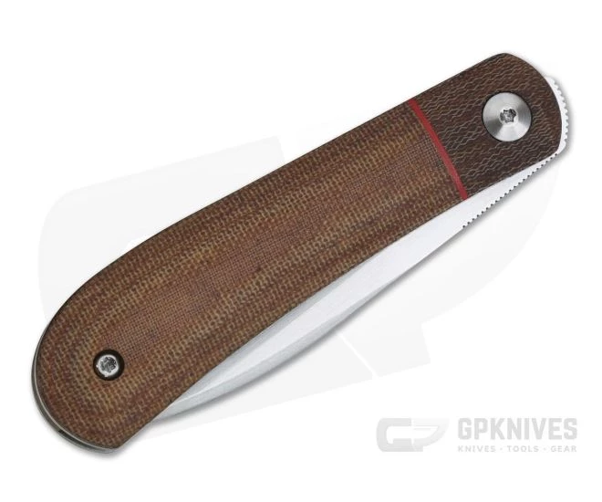 Handle: Modern and clean in form and function, the frame of the handle is formed by two thick satin finished titanium liners. These liners also form the liner locking mechanism which provides solid, secure lock up along with smooth operation. Giving the Mini Zulu a timeless appearance, the scales and backspacer are made from Natural Canvas Micarta with cross-cut brown canvas Micarta bolsters all offset with red liner material. The knife is finished off with satin titanium hardware and a brushed stainless steel shield on the show side.