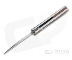 Handle: Thick satin finished titanium liners support white fiber liners that highlight the rugged Micarta scales, crosscut natural canvas for the bolsters and rugged burlap for the covers with a satin finished stainless steel shield on the front. One liner forms the liner lock mechanism, which provides solid, secure lock up along with smooth operation. Hardware is satin finished titanium. Embroidered Pena nylon zipper pouch included.