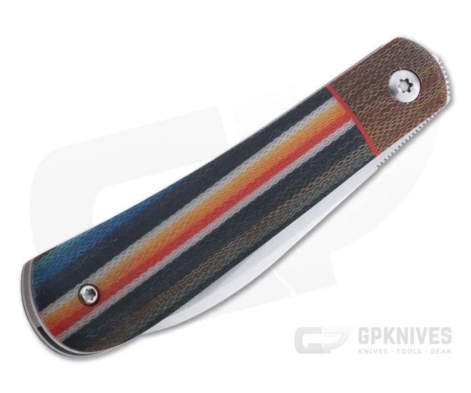 Handle: Modern and clean in form and function, the frame of the handle is formed by two thick satin finished titanium liners. These liners also form the liner locking mechanism which provides solid, secure lock up along with smooth operation. Giving the Swayback vivid style, the bolsters and back spacer are made from crosscut natural canvas Micarta with eye-catching custom Mexican Blanket G-Carta covers all offset with red liner material. The knife is finished off with satin titanium hardware and a brushed stainless steel shield on the show side.