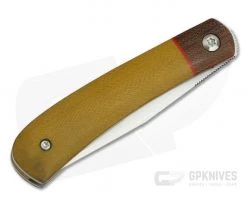 Handle: Modern and clean in form and function, the frame of the handle is formed by two thick satin finished titanium liners. These liners also form the liner locking mechanism which provides solid, secure lock up with smooth operation. Giving the Trapper a timeless look the scales and backspacer are made from crosscut Natural Canvas Micarta with cross-cut brown canvas Micarta bolsters all offset with red liner material. The knife is finished off with satin titanium hardware and a brushed stainless steel shield on the front.