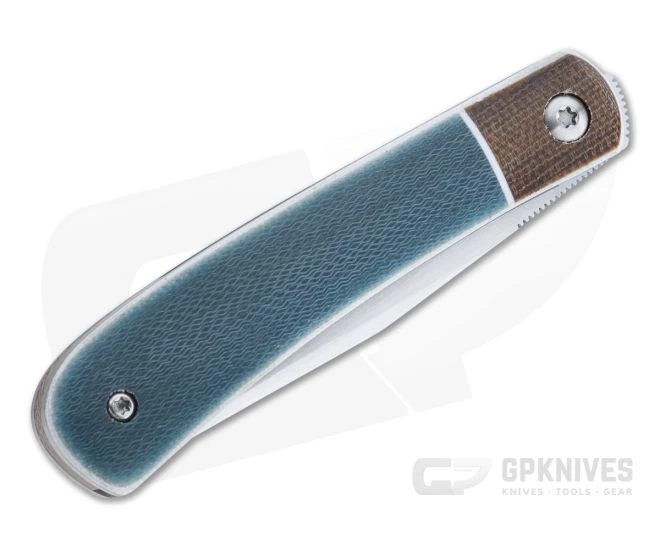 Handle: Modern and clean in form and function, the frame of the handle is formed by two thick satin finished titanium liners. These liners also form the liner locking mechanism which provides solid, secure lock up with smooth operation. Giving the Trapper a timeless yet striking look, the scales are made from crosscut Aqua G-Carta with burlap Micarta bolsters offset with white liner material. The knife is finished off with satin titanium hardware, canvas Micarta back spacer and a brushed stainless steel shield on the front.