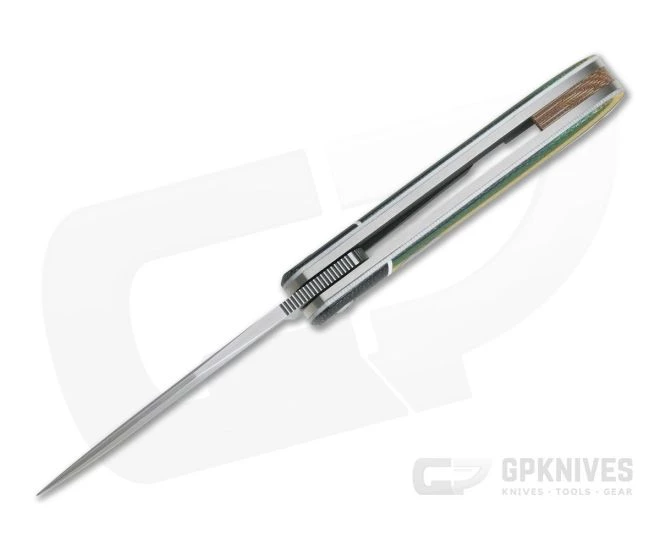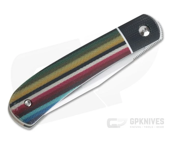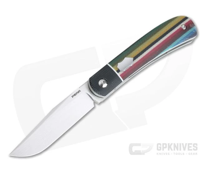 Enrique Pena is known for his remarkable fit, finish and function as well as the blending of traditional and tactical in his designs. This Pena Custom Trapper Front Flipper is no exception. The hand rubbed satin finished CPM-154 blade is razor sharp, perfectly centered and super smooth with a modern, titanium liner construction. The handles call back to the old time slip joints but are made with handsome and rugged Mexican Blanket Crosscut G-Carta covers, black Canvas Micarta bolsters and white liners.