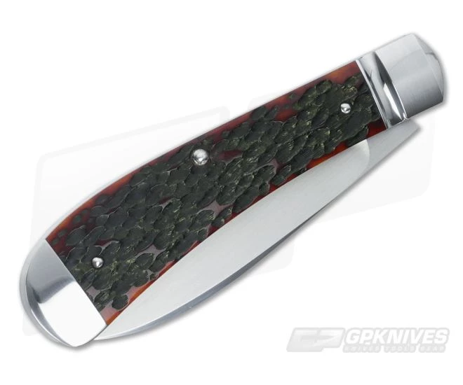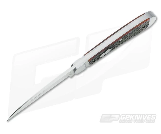The Handle: Unlike most maker’s slip joint knives, the bolsters and liner of this knife are milled from one solid piece of stainless steel resulting in a clean look with no visible pivot pin in the middle. Pena chose a stunning dark jigged bone for the handle scales and gave all of the stainless hardware a great looking satin finish to match the blade.