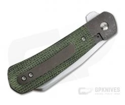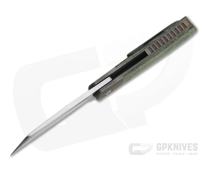 The Handle: Modern and clean in form and fuction, the frame of the handle is formed by two thick titanium liners which also create the integral bolsters. The rear liner forms a rock solid “bolster lock” mechanism that is smooth and reliable. The bolsters, liners and 3D machined pocket clip all feature a blasted, tumbled and bronze anodized finish while the partial backspacer has also been anodized bronze to match. Elegant and rugged green canvas Micarta handle scales complete the look and provide a very comfortable grip in the hand. Satin Torx hardware completes the construction.
