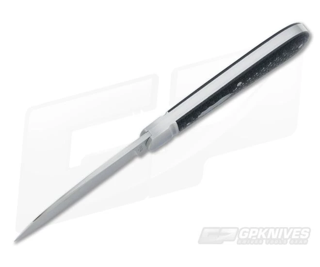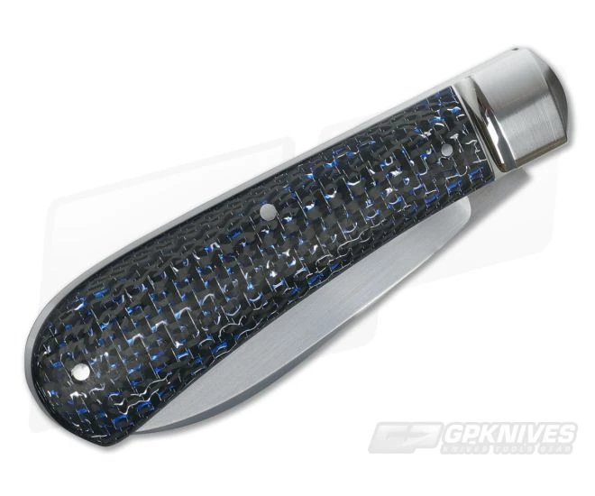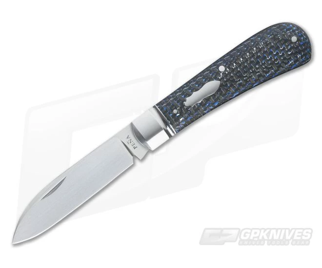 The Frame: Unlike most maker’s slip joint knives, the bolster and liner of this knife are milled from one solid piece of stainless steel resulting in a clean look with no visible pivot pin in the middle of the bolster. Pena chose a gorgeous looking blue and silver twill carbon fiber for the handle scales and gave all of the stainless hardware a great looking satin finish to match the blade.