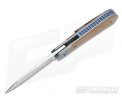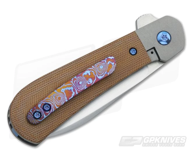 The Handle: Modern and clean in form and fuction, the frame of the handle is formed by two rather thick bead-blasted titanium liners. These liners also create integral bolsters as well as a rock solid frame lock (also known as a bolster lock) mechanism. To add to the good looks and awesome feel of the handle, natural canvas micarta has been attached via blue anodized titanium torx construction. Complimented with blue titanium pivot, full titanium backspacer and finished with a custom MokuTi pocket clip for tip-up right-hand carry.