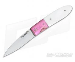 Frank Centofante custom knife with pink pearl handle over pink anodized machine turned titanium liners. The bolsters have been anodized pink to match, and have a unique finish to them as well. Blade is constructed of hand rubbed ATS-34 stainless steel with a razor sharp edge. A small backspacer sits towards the rear of the knife, and has some light filework to it.