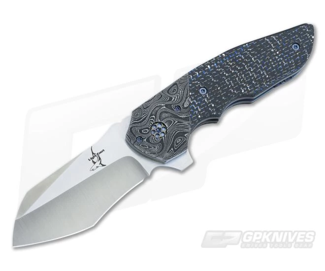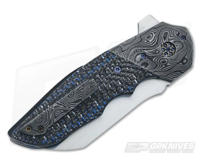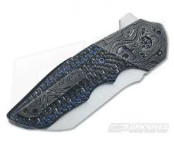 The Handle: A masterpiece in overbuilt, the handle is comfortable even for it’s size. .14 inch thick titanium liners have been blue anodized and provide the foundation. One of which creates the liner locking mechanism with lock face insert for smooth, easy unlocking of the blade. Working with the liners are blue/silver carbon fiber handle scales. This material reminds me of a starry night sky, just a pleasure to view. These meet up with handsome Chad Nichols damascus bolsters at a slant adding to the overall killer looks of this package. All titanium hardware was used on this piece including the revolver cylinder-styled pivot.