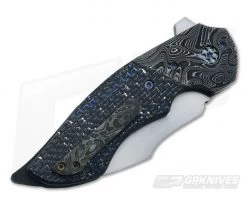The Handle: A masterpiece in overbuilt, the handle is comfortable even for it’s size. .14 inch thick titanium liners have been blue anodized and provide the foundation. One of which creates the liner locking mechanism with lock face insert for smooth, easy unlocking of the blade. Working with the liners are blue/silver carbon fiber handle scales. This material reminds me of a starry night sky, just a pleasure to view. These meet up with handsome Chad Nichols damascus bolsters at a slant adding to the overall killer looks of this package. All titanium hardware was used on this piece including the revolver cylinder-styled pivot.