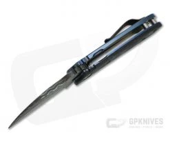 The Grindhouse Knives TMAx Flipper designed and built by Sam Jones is a bit thicker and beefier than the TMA delivering a compact yet seriously robust folder. A long flipper tab, hefty blade and ball bearing pivot deliver ultra-fast deployment with tank like lock up afforded by the titanium frame lock. This version comes with a striking Iguana pattern, Chad Nichols Stainless Damascus blade, Marbled Carbon Fiber handle scale and blue anodized titanium liner and frame.