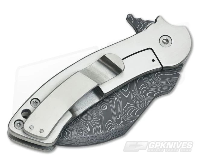 The Blade: .215 inch thick Chad Nichols San Mai damascus on this one with a stainless CTS XHP Carpenter Steel core. It looks awesome in this sheepsfoot-wharny styled blade finished with a shaving sharp polished edge. An integral flipper tab works in conjunction with a ball bearings pivot system creating some silky smooth flipping action. The user can either work utilizing the flipper tab as a guard or choke up on a built in choil set just behind the cutting edge for finer tasks. From upper thumb ramp to scooped cut out, any grip should be comfortable.