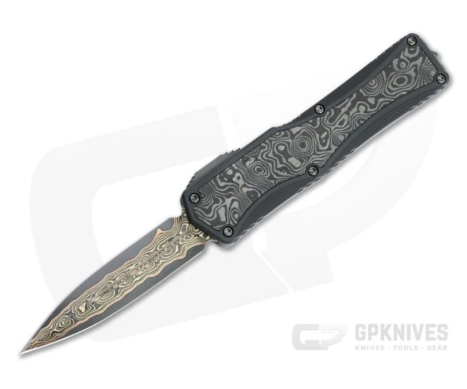 The Heretic Knives Colossus is a tactically inspired double action, out-the-front automatic that comes in just under the length of the Manticore-X for easy carry while offering a more heavy-duty construction. This custom version has a hand ground Bakers Forge San Mai Damascus dagger blade, black anodized aluminum handle, “Black Dunes” Fat Carbon inlays and black DLC coated hardware. S/N 041