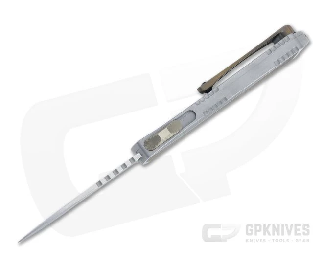 The Heretic Knives Manticore-S is the smallest of the Manticore Series of double action, out-the-front, automatic knives. This very special Hand Ground custom version comes with a stainless steel handle, hand satin flats, desert ironwood inlays and bronze hardware with a hand hollow ground, high polish finished Elmax Tanto blade. S/N 009.